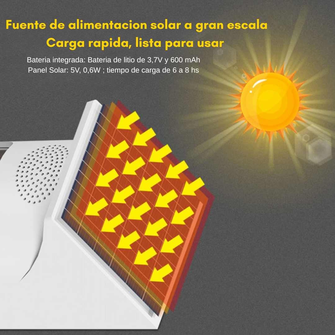 - Funciona con batería de litio recargable mediante energía solar