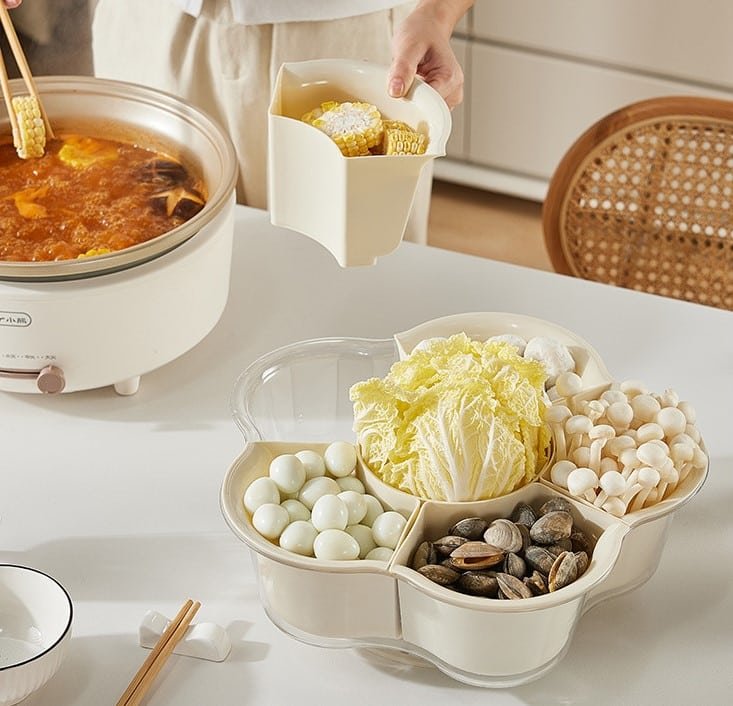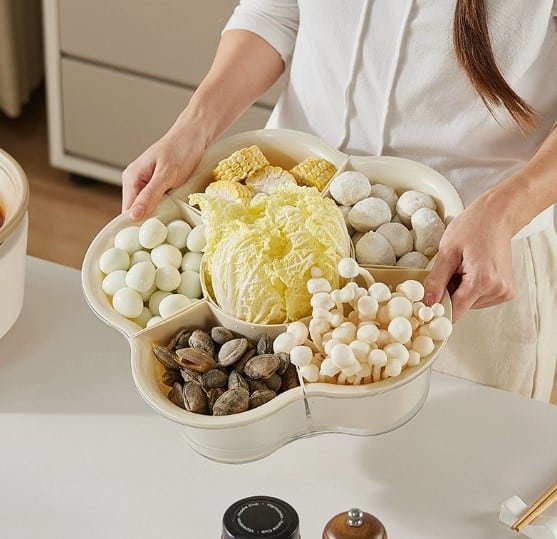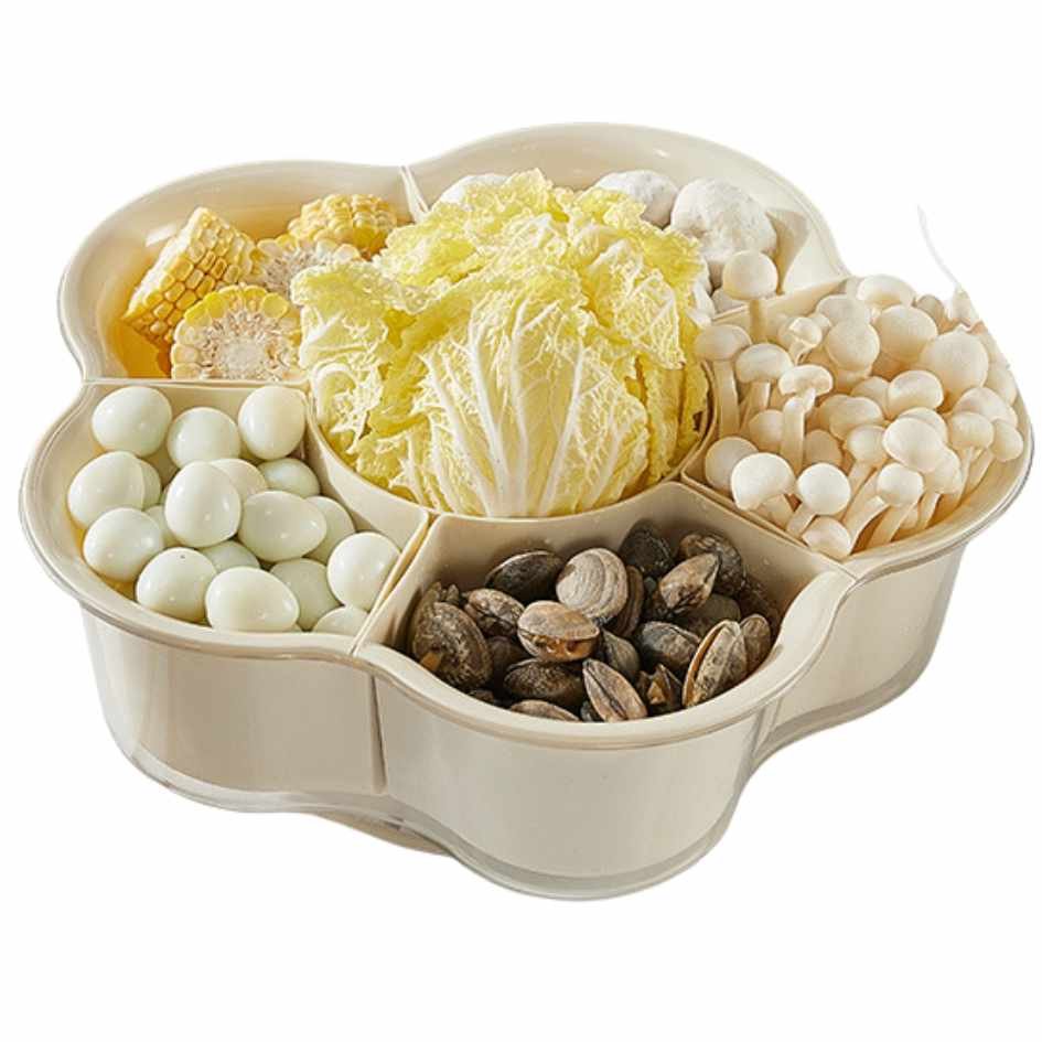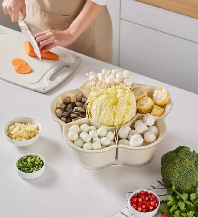•Rotable: esta bandeja para verduras dividida para contener diferentes tipos de alimentos puede ser desmontable y giratoria. Úselo como fuente para servir, fuente para verduras, bandeja para frutas o bandeja para refrigerios.