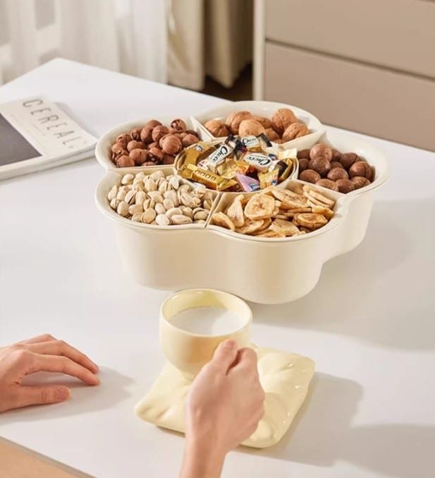 •6 compartimento: bandeja para servir giratoria de 360° con 6 compartimentos separados desmontables, puede servir una variedad de alimentos, frutas, verduras, nueces y dulces. Almacenamiento fácil y limpieza fácil.