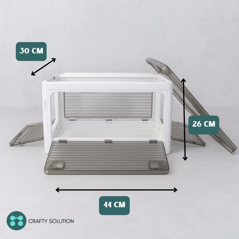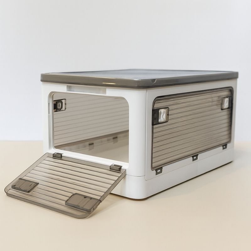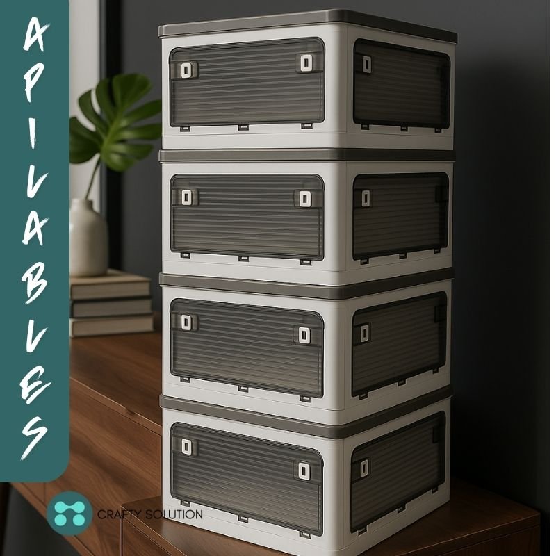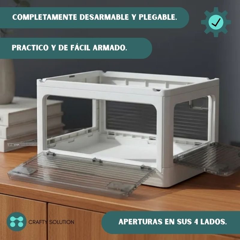 - 1 Caja organizadora plástica apilable con tapa y apertura en 4 lados.