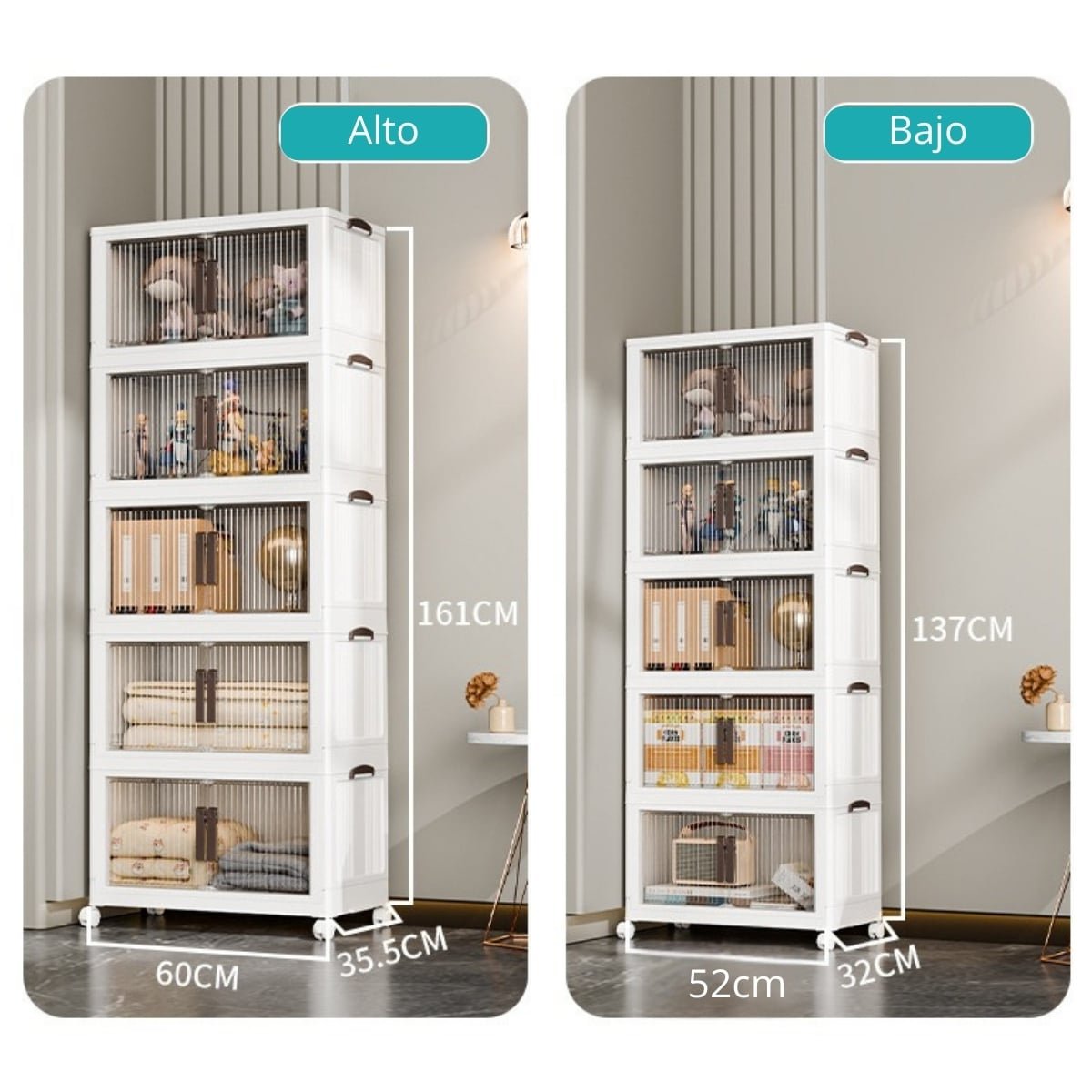 • Modelo bajo: 5 niveles con 52 cm de ancho, ideal para espacios reducidos donde se requiere practicidad sin perder capacidad.