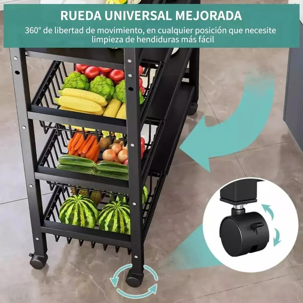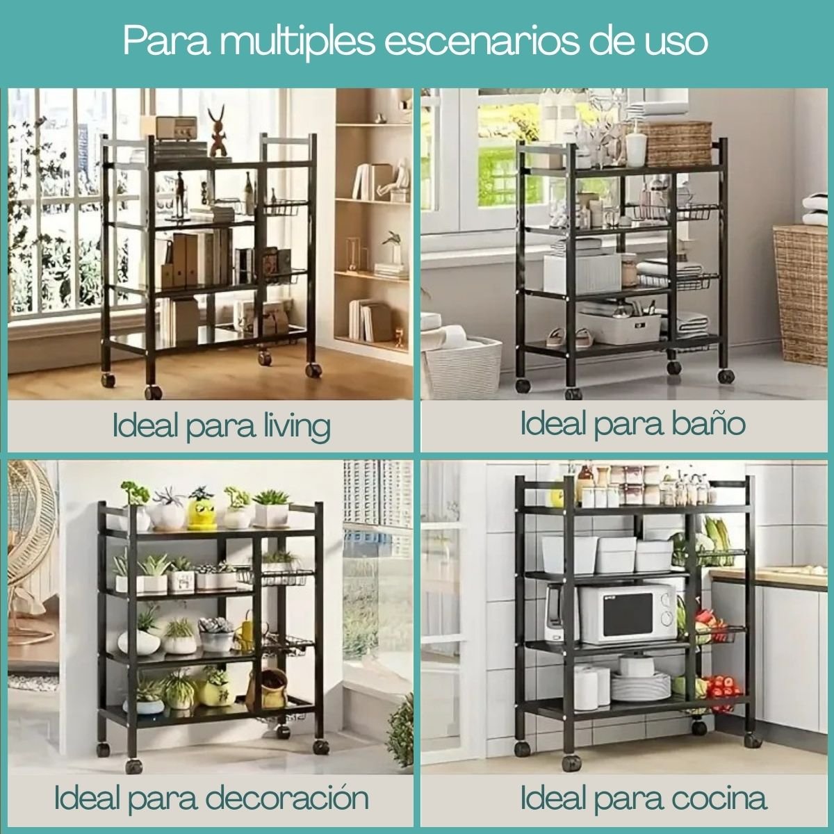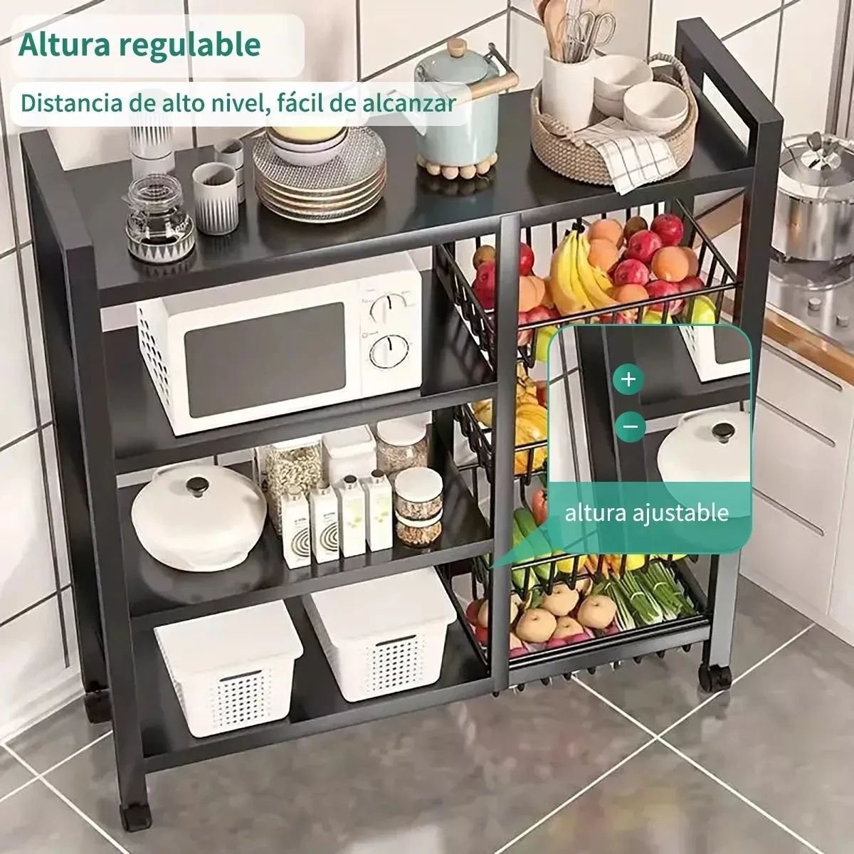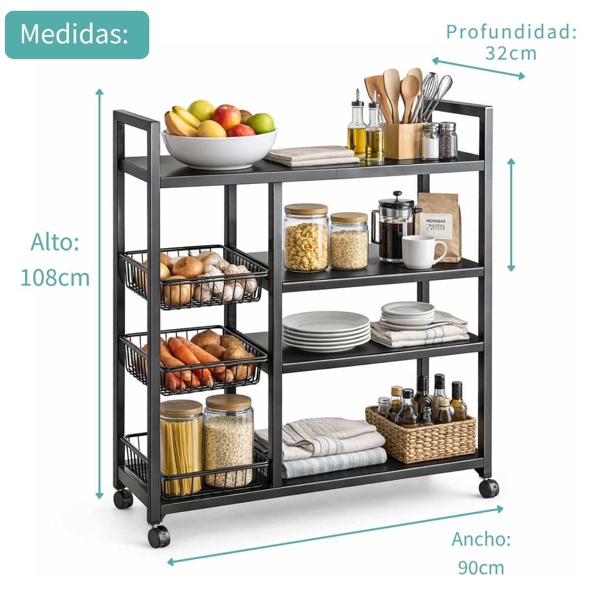 Los cuatro niveles incluyen cestas de malla metálica removibles, ideales para frutas, verduras, utensilios o electrodomésticos medianos. Asimismo, la ventilación mantiene los alimentos frescos por más tiempo. Los bordes elevados evitan que los objetos rueden fuera del estante.