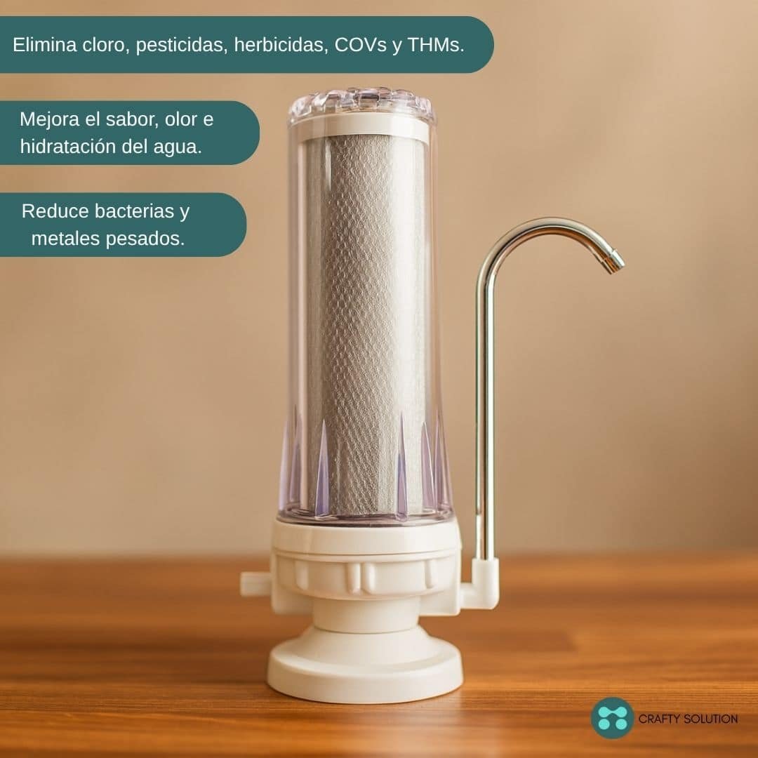 CRAFTY SOLUTION te ofrece una solución práctica, eficiente y saludable para mejorar la calidad del agua en tu hogar. Este purificador sobre mesada es ideal para cualquier cocina gracias a su diseño compacto y moderno.