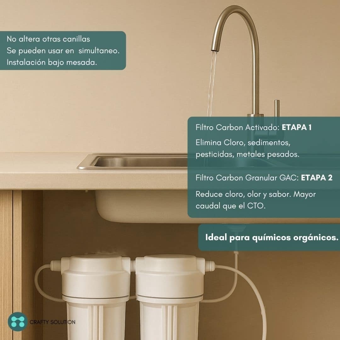 Cada etapa elimina contaminantes, suaviza el agua y mejora su sabor. Gracias a su diseño compacto, los purificadores Crafty Solution ofrecen una opción ecológica y económica para disfrutar de agua pura todos los días.
