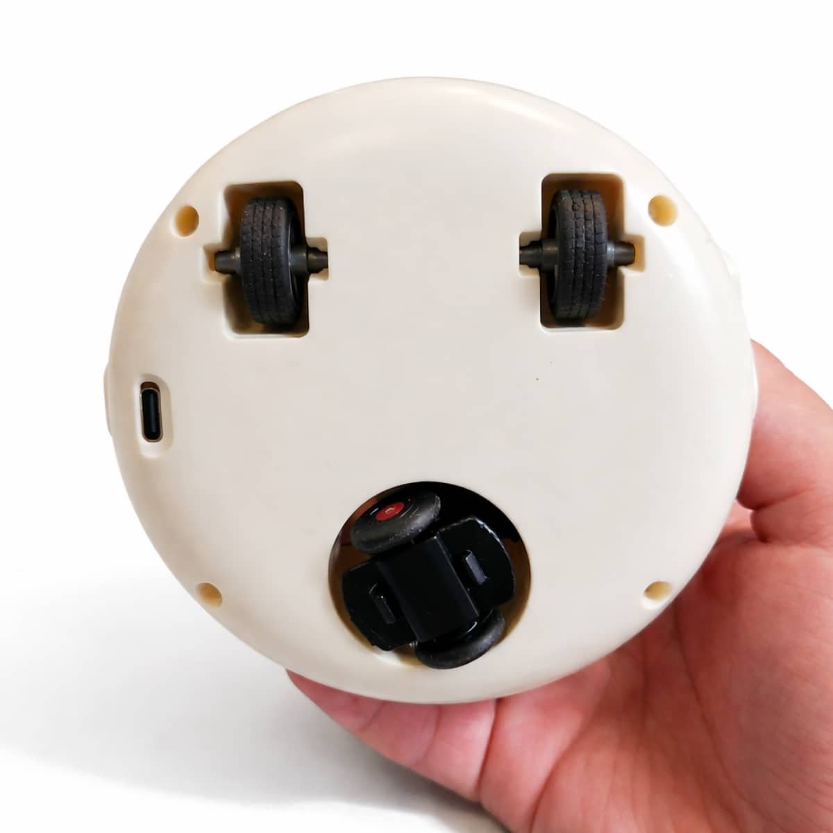Se desplaza de forma autónoma gracias a sus dos ruedas simples y una rueda doble, adaptándose a diferentes superficies y evitando obstáculos durante su recorrido.