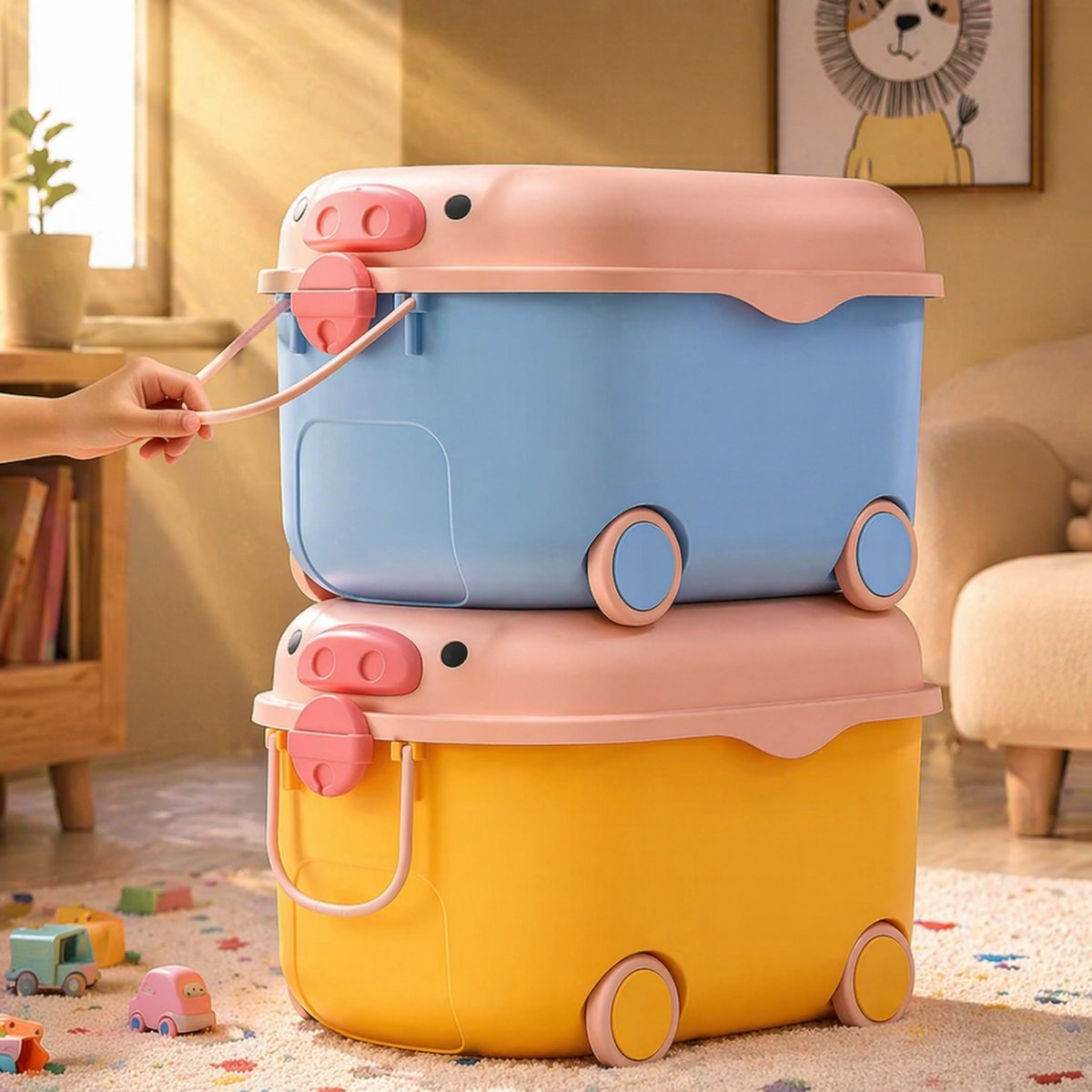 Tenemos para ofrecerte el juguetero organizador de juguetes con ruedas, disponible en dos combinaciones de colores: Celeste con rosa o Amarillo con rosa. Este práctico organizador está diseñado especialmente para niños, combinando funcionalidad, seguridad y creatividad.