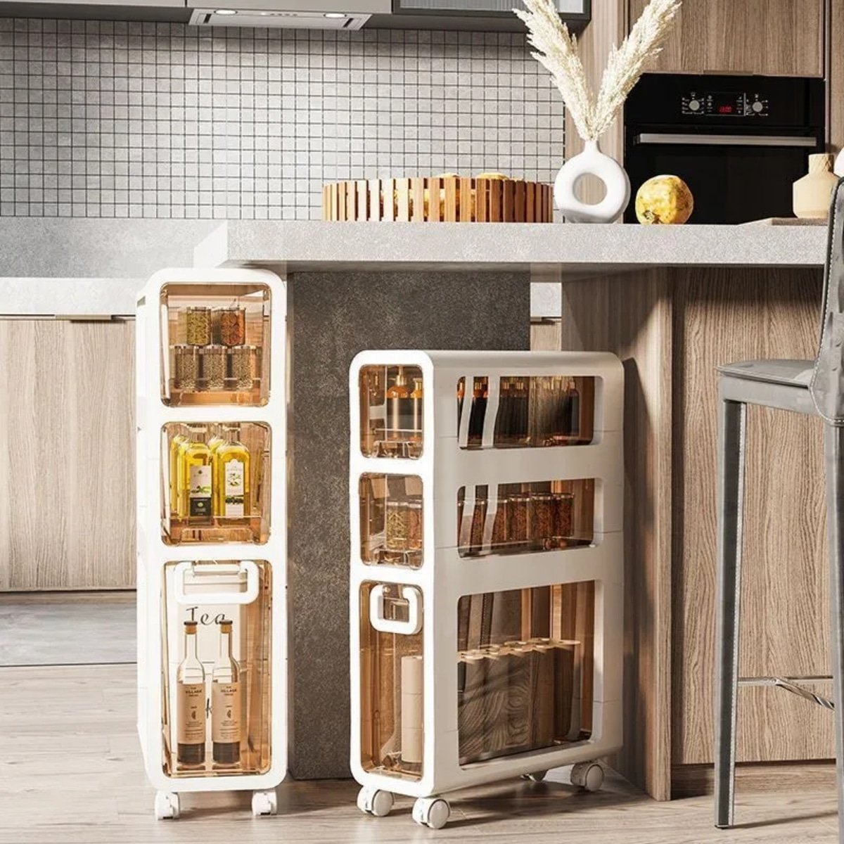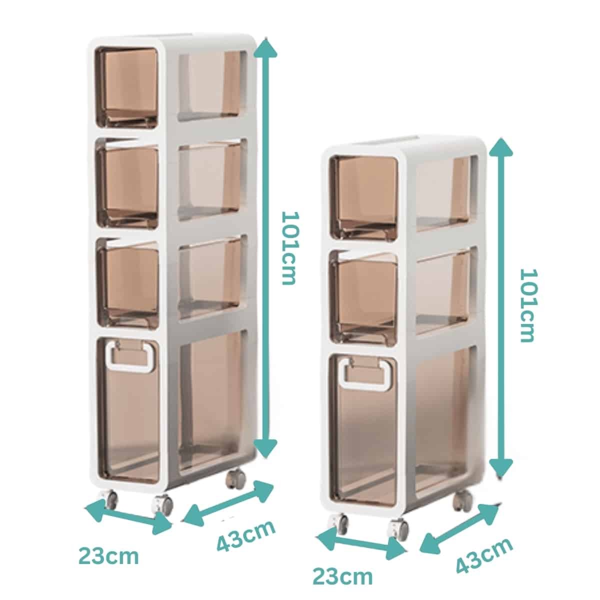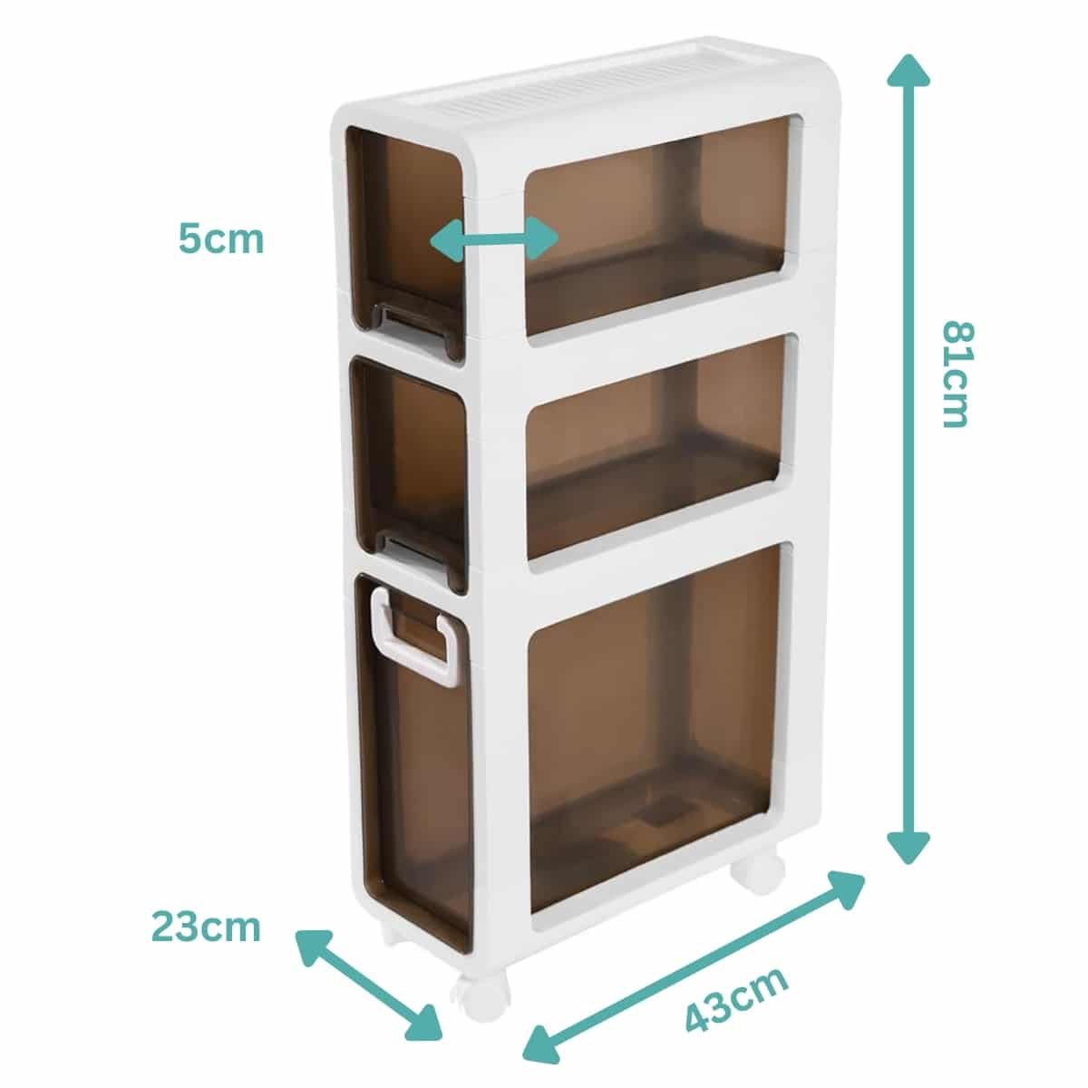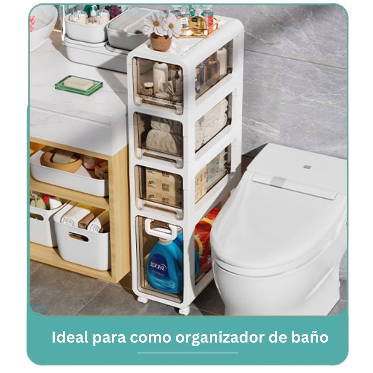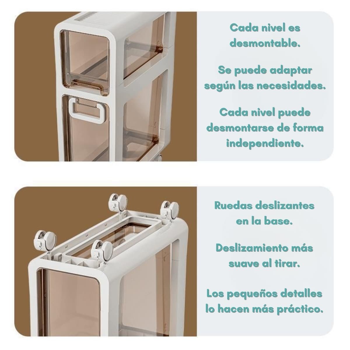 Este organizador no solo maximiza el espacio vertical, sino que también facilita la movilidad gracias a sus ruedas con freno.