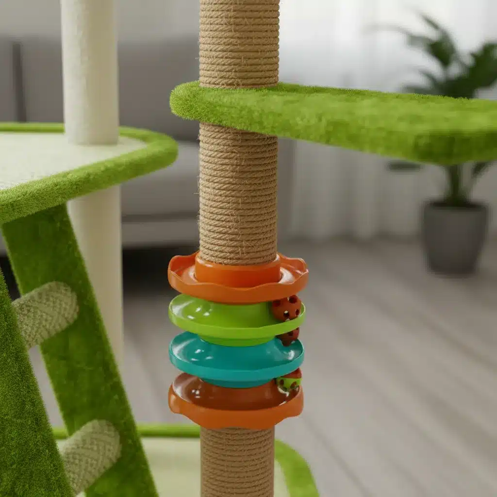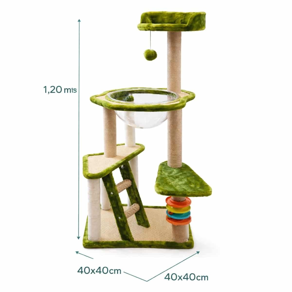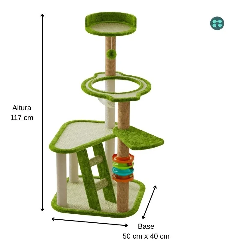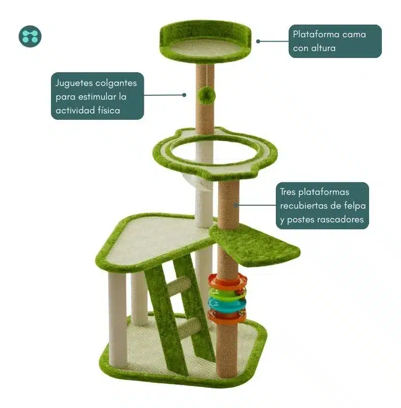 - Diseño multifuncional: incluye plataformas a diferentes alturas, postes rascadores y juguetes colgantes para estimular la actividad física y mental.