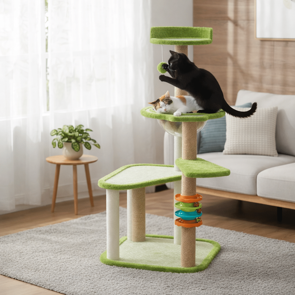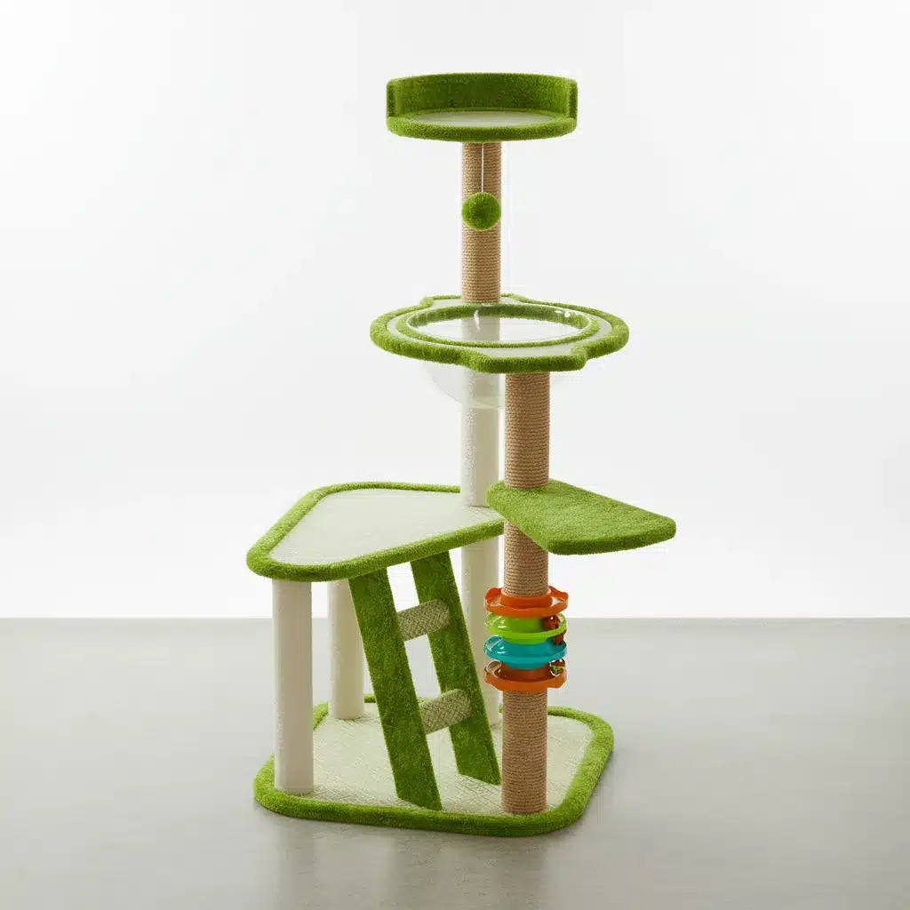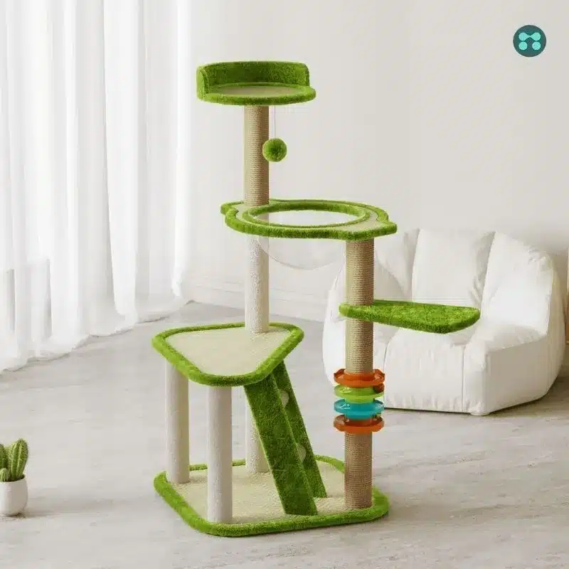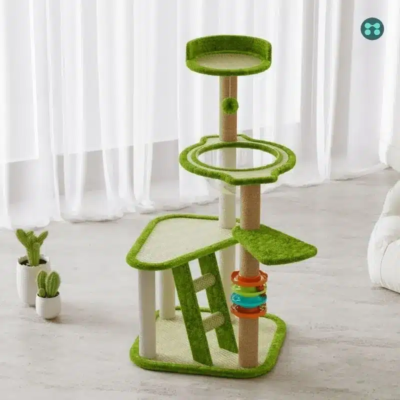 - Diseño multifuncional: incluye plataformas a diferentes alturas, postes rascadores y juguetes colgantes para estimular la actividad física y mental.