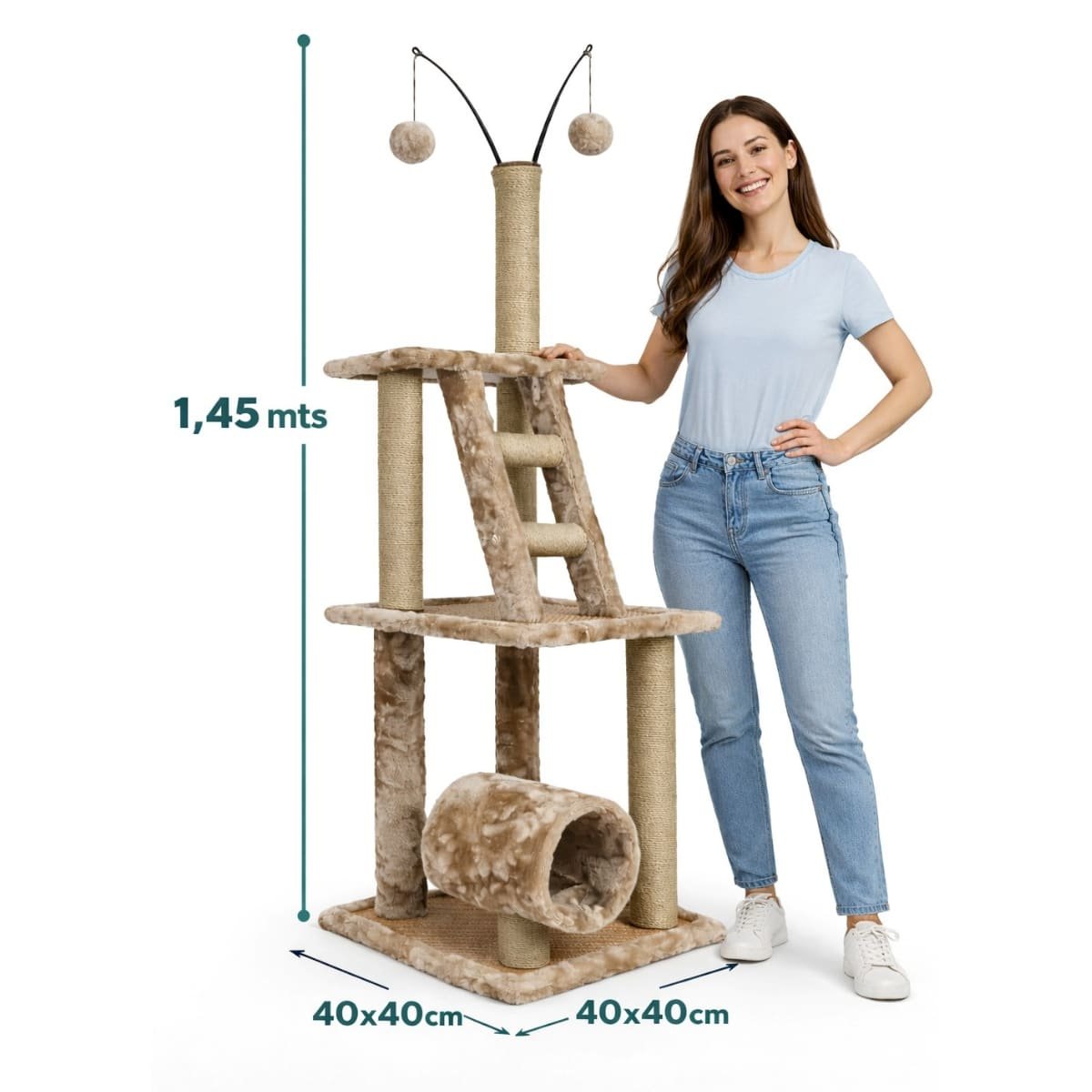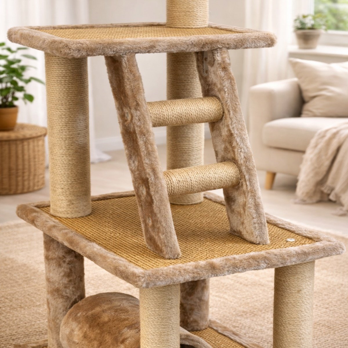 - Materiales de primera calidad: Base de aglomerado resistente, postes cubiertos de sisal natural y plataformas acolchadas con suave felpa.