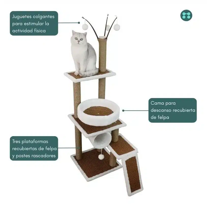 - Diseño Multinivel: Plataformas espaciosas, hamaca acogedora y postes para rascar.